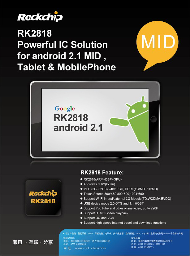 瑞芯微電子在本屆通信展發(fā)布了基于RK2818平臺(tái)的3G移動(dòng)互聯(lián)方案,領(lǐng)創(chuàng)智能平板電腦的中國(guó)芯崛起。