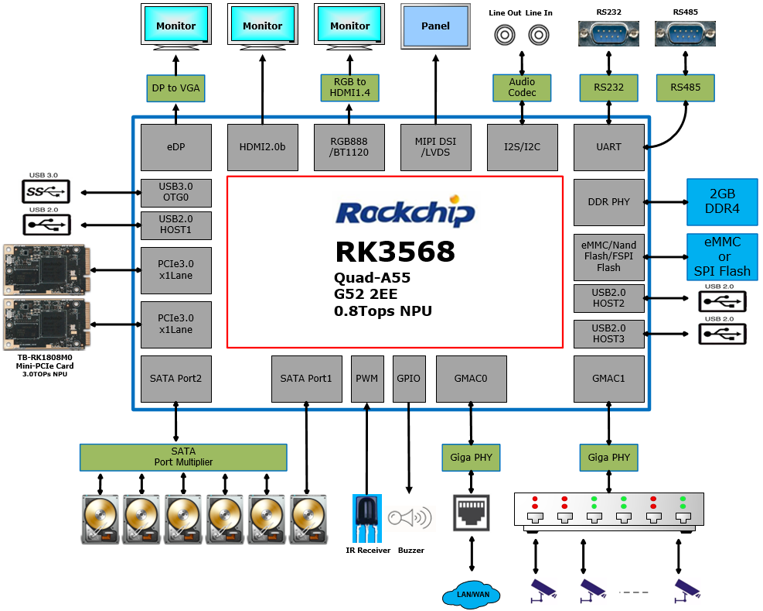 RK3568后端NVR/XVR方案,在產(chǎn)品功能上除傳統(tǒng)的接入、存儲(chǔ)、轉(zhuǎn)發(fā)、解碼應(yīng)用,基于其高性能AI算力,還可在人臉對(duì)比報(bào)警、智能人車檢索、越界預(yù)警、火警可視化預(yù)警等方面展開智能化應(yīng)用,重構(gòu)邊緣價(jià)值。