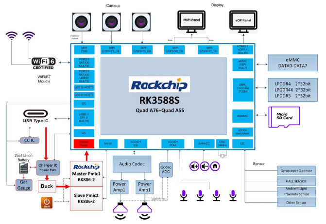 RK3588S同樣配備RK806-2雙PMIC的供電方案;存儲采用 LPDDR4X、eMMC、SD3.0;擁有 eDP TX、MIPI D/C PHY TX、MIPI D/C PHY RX、MIPI DPHY RX、PCIe20、TYPEC、音頻輸出、陣列MIC輸入等外設接口。