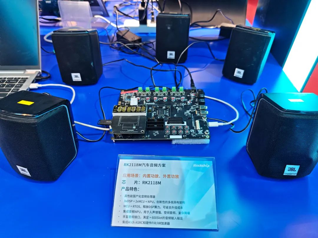 現(xiàn)場展出了數(shù)款基于RK2118M的外置功放產(chǎn)品,已在多個主流新能源汽車品牌落地商用?;诟咚懔Φ墓Ψ偶軜?gòu),RK2118M支持搭載超過20個以上的揚聲器,并可以同時支持運行環(huán)繞音效、主動聲浪,主動降噪等中高階音效算法。