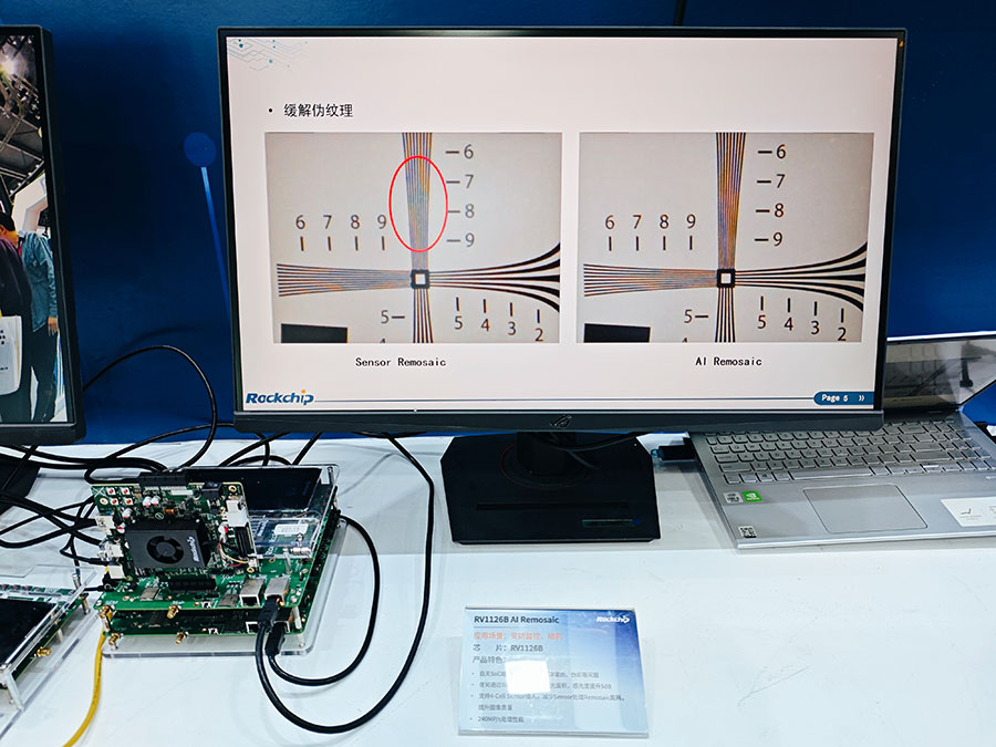 作為本次的重磅新品,瑞芯微新一代4K機(jī)器視覺芯片RV1126B備受關(guān)注。RV1126B具備3T強(qiáng)勁算力,可運(yùn)行2B以內(nèi)規(guī)模的大語言模型及多模態(tài)模型,針對(duì)算力、AI-ISP、AOV3.0、超級(jí)編碼、防抖等性能均有明顯升級(jí)。現(xiàn)場(chǎng)演示了多項(xiàng)引領(lǐng)行業(yè)的技術(shù)應(yīng)用,賦能各類視覺設(shè)備實(shí)現(xiàn)從“看得見”到“看得懂”的質(zhì)的飛躍: