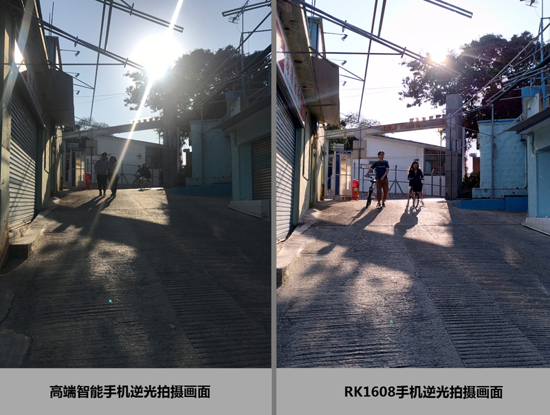 Two groups of photos which are respectively based on high-end mobile phone solution and RK1608, showing the backlight, night view environment, RK1608 more prominent image signal processing, HDR, noise reduction and technical advantages such as exposure to balance.